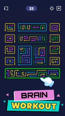 L'estetica di **Arrows Escape** è un elogio alla chiarezza e alla funzionalità. Dimentica le distrazioni: qui domina un design pulito, con uno sfondo nero profondo che esalta la vivacità delle frecce luminose. Questa scelta minimalista non solo facilita la concentrazione sui puzzle, ma conferisce anche un tocco di eleganza insolita. Non troverai animazioni superflue o effetti grafici strabilianti, né sarai interrotto da innumerevoli popup. La tua esperienza è al centro: personalizza vibrazioni e suoni per adattarli al tuo momento, creando l'atmosfera ideale per la tua evasione mentale.