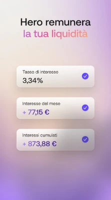 Hero ti equipaggia con strumenti finanziari all'avanguardia: benefici di un IBAN dedicato, la flessibilità di sottoconti illimitati e l'eleganza funzionale delle carte Visa Platinum, tutte integrate per rendere pagamenti e spese quotidiane un gioco da ragazzi. Ma non ci limitiamo a semplificare: premiamo la tua intelligenza finanziaria. Hero offre una remunerazione attrattiva sul saldo del tuo conto, fino al 3% a seconda del piano scelto, permettendoti di far fruttare la tua liquidità. Inoltre, la nostra innovativa soluzione di finanziamento delle fatture fornitori ti consente di preservare la cassa pagando i tuoi partner commerciali al posto tuo, con un comodo rimborso dilazionato fino a tre mesi, ideale per ampliare risorse e capacità produttiva.