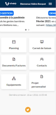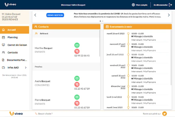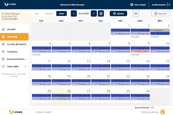 My Vivéo offre la gestione online dei servizi a domicilio con aggiornamenti in tempo reale. Comunica facilmente con assistenti e agenzia, valuta le prestazioni e accedi a un carnet di liaison digitale. Archivia documenti importanti in uno spazio sicuro e condividi l'accesso con professionisti sanitari per un monitoraggio completo.