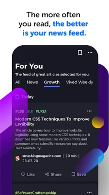 Ciò che rende Vived davvero eccezionale è la sua capacità di adattarsi a te. La piattaforma offre un feed di contenuti IT completamente personalizzato, che si perfeziona man mano che interagisci. Più articoli esplori, più precisa diventa la selezione, garantendoti di ricevere solo ciò che è più pertinente ai tuoi interessi professionali. Con oltre 150 tag disponibili per seguire i tuoi argomenti preferiti, hai il pieno controllo della tua esperienza. Inoltre, Vived è molto più di una semplice libreria di articoli: è una vibrante comunità di oltre 10.000 sviluppatori, un luogo dove la conoscenza è condivisa liberamente e interamente senza costi. A completare l'offerta, troverai anche opportunità di lavoro mirate, studiate per la tua crescita di carriera nel settore IT.